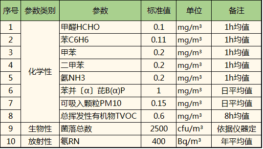 內(nèi)容介紹: 2010年國家頒布的室內(nèi)空氣質(zhì)量檢測(cè)標(biāo)準(zhǔn)全部參數(shù)為(見下圖)