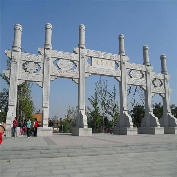 園林景區(qū)進口石牌坊也鳴園林景看門樓,也是園林景看牌樓的一種,是我們中國傳統(tǒng)的具有特色的一種門形建筑物,一般比較高大,但是占地面積小,被應用在很多景區(qū)、村口、言殿、寺廟、陵墓、街道、古鎮(zhèn)等進口,造型獨特,雕工精湛,結合精美的圖案和別致的造型,獲得人們的喜歡。就如一座藝術品,拔地而起,氣魄恢宏,引人注目。