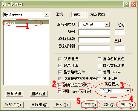 4.點(diǎn)擊上圖 6 處, 切換到“高級”標(biāo)簽(如下圖)。 在1處選中剛建立的站點(diǎn)名稱(mysite),將2處的選鉤鉤上,在3處的“傳送模式”選擇二進(jìn)制,點(diǎn)擊4處“應(yīng)用”。至此您的FTP站點(diǎn)已經(jīng)建立成功;
