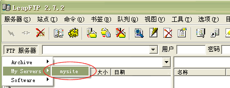 5.您可以點(diǎn)擊上圖5處“連接”按鈕,直接進(jìn)入連接狀態(tài);也可以回到主菜單點(diǎn)擊 “FTP 服務(wù)器”-> “My Servers” -> “mysite” 進(jìn)入連接狀態(tài)。