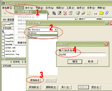 2. 運(yùn)行 LeapFTP,點(diǎn)擊1處(站點(diǎn)->站點(diǎn)管理器),彈出“站點(diǎn)管理器”窗口;在2處選擇“My Servers”項(xiàng),然后在3處點(diǎn)擊“添加站點(diǎn)”按鈕,在彈出的窗口4處輸入您喜歡的站點(diǎn)名稱(如:mysite);