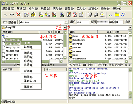 6.連接成功后的界面如下圖所示。左上框?yàn)楸镜啬夸洠梢酝ㄟ^ 1 處的下拉菜單選擇您要上傳文件的目錄,選擇后該目錄下的所有文件都會(huì)顯示在這個(gè)框里。 選擇您要上傳的文件,并點(diǎn)鼠標(biāo)“右鏈”->“上傳”, 這時(shí)在隊(duì)列欄里會(huì)顯示正在上傳及未上傳的文件, 當(dāng)您的文件上傳成功完成后,在命令欄里會(huì)出現(xiàn)“傳送完成”的提示,此時(shí)在過程目錄欄里就可以看到您上傳的文件了。