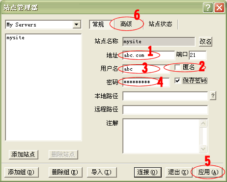 3.點(diǎn)擊“確定”后,出現(xiàn)以下界面。在1處輸入您的站點(diǎn)地址(如:abc.com),將2處“匿名”前的選鉤去掉,在3處輸入FTP用戶名(如:abc),在4處輸入FTP密碼(將保存密碼前的選鉤打上),點(diǎn)擊5處“應(yīng)用”按鈕;