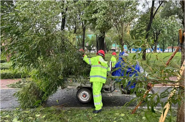 物業(yè)人員與志愿者風(fēng)后清理現(xiàn)場