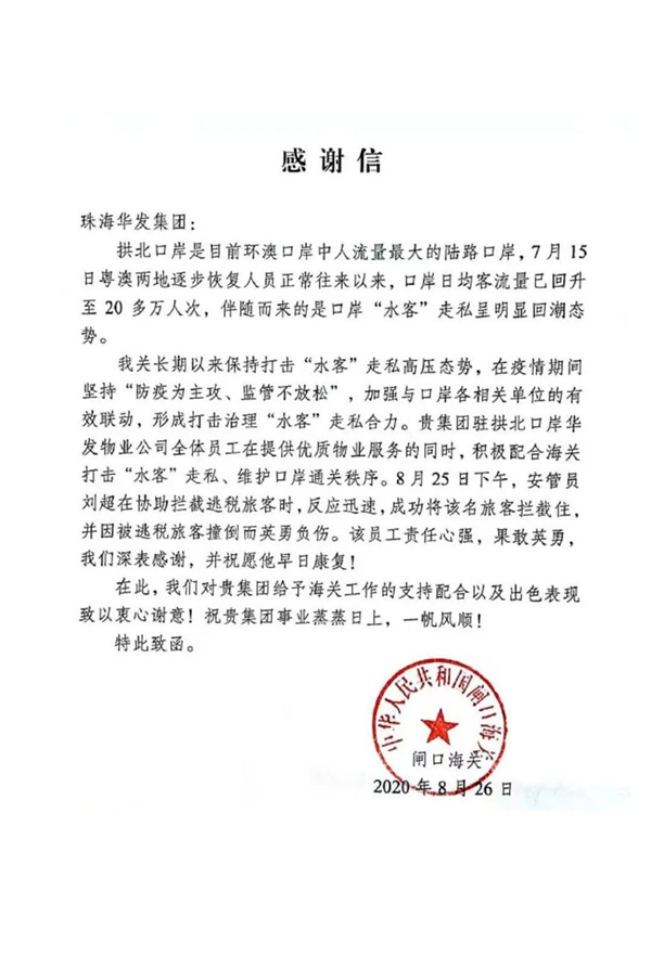 近日,集團(tuán)收到一封來自閘口海關(guān)的感謝信,信中描述了拱北口岸入境大廳北門保安陳有祥協(xié)助攔截逃避海關(guān)監(jiān)管旅客的英勇行為,對以陳有祥為代表的駐拱北口岸華發(fā)物業(yè)員工認(rèn)真負(fù)責(zé)的工作態(tài)度及專業(yè)高效的服務(wù)水準(zhǔn),給予真誠褒獎和衷心感謝。