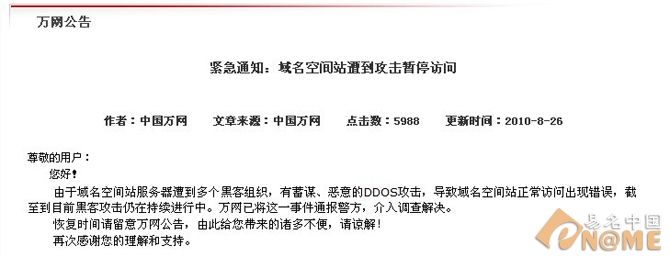 易名中國(guó)(9月3日)訊,據(jù)悉,連日來已有萬(wàn)網(wǎng)、新網(wǎng)、新網(wǎng)互聯(lián)等域名注冊(cè)商連續(xù)遭遇黑客折DDOS惡意攻擊,造成大部分域名訪問出錯(cuò)、DNS服務(wù)器異常、域名功能管理暫停等問題,損失巨大,目前萬(wàn)網(wǎng)、新網(wǎng)互聯(lián)、新網(wǎng)總部稱已上報(bào)警方。
